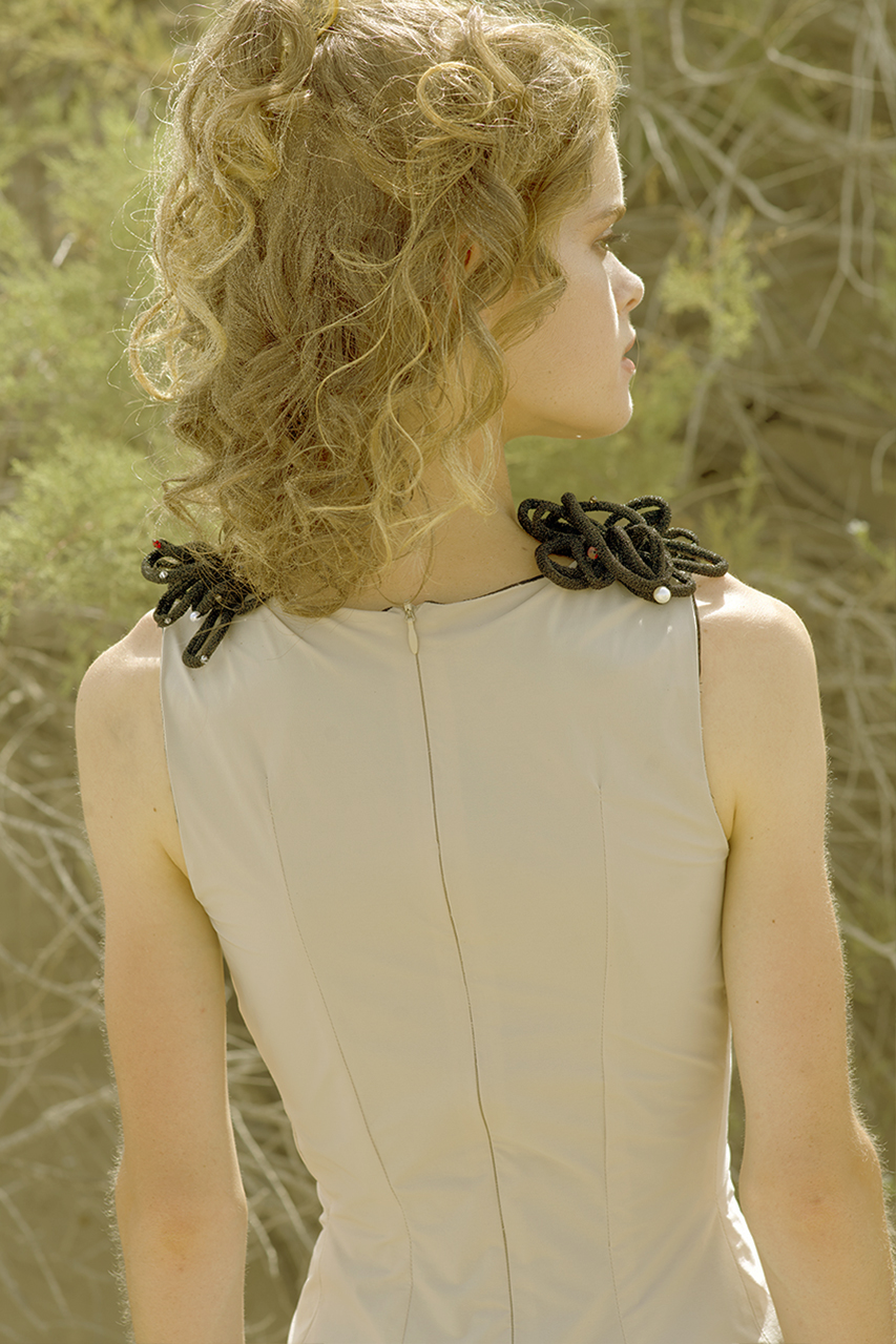 Comfortable short elastic Dress in elastic cotton color beige, with darts (front and back),Lurex lace Hand-embroidery with pearl and crystal embellishments on the front of dress, forming waves and creating a very elegant volume.
